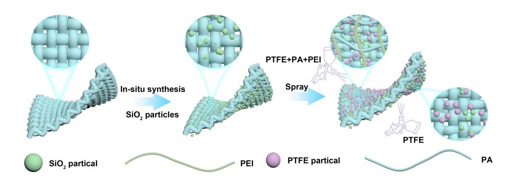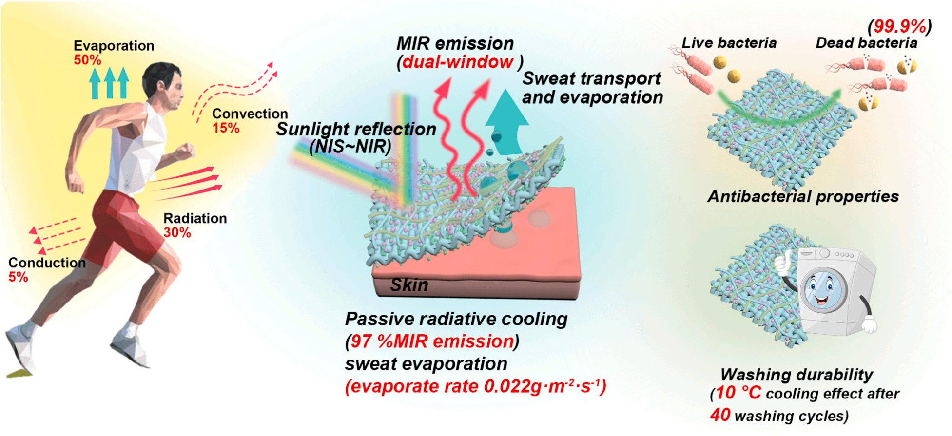 近期,成人网站生态染整技术研究室余圆圆副教授、王强教授团队在Chemical Engineering Journal期刊上发表了题为“Excellent durability and multifunctional textiles with dual-mode evaporative and radiative cooling enabled by in-situ growth of SiO2and electrostatic network coating”的研究成果,23级硕士研究生张露璇为论文第一作者(//doi.org/10.1016/j.cej.2025.168259)。本研究设计了一种基于棉织物的新型辐射/蒸发双模式冷却纺织品(Janus RC@Cotton)。首先,在棉纤维表面原位生长SiO2粒子和喷涂PTFE,制备具有双窗口辐射制冷功能的SiO2@Cotton。然后,在此基础上,利用聚乙烯亚胺(PEI)/植酸(PA)静电网络在SiO2@Cotton辐射制冷织物的不同侧构建不对称的润湿性,使其具有优异的单向导湿效果,提升织物的吸湿排汗性能,增强蒸发制冷效果,进一步提升织物的降温能力(图1)。另外,静电涂层网络还赋予了多功能织物优异的耐久性(图2)和高效的抗菌性能。