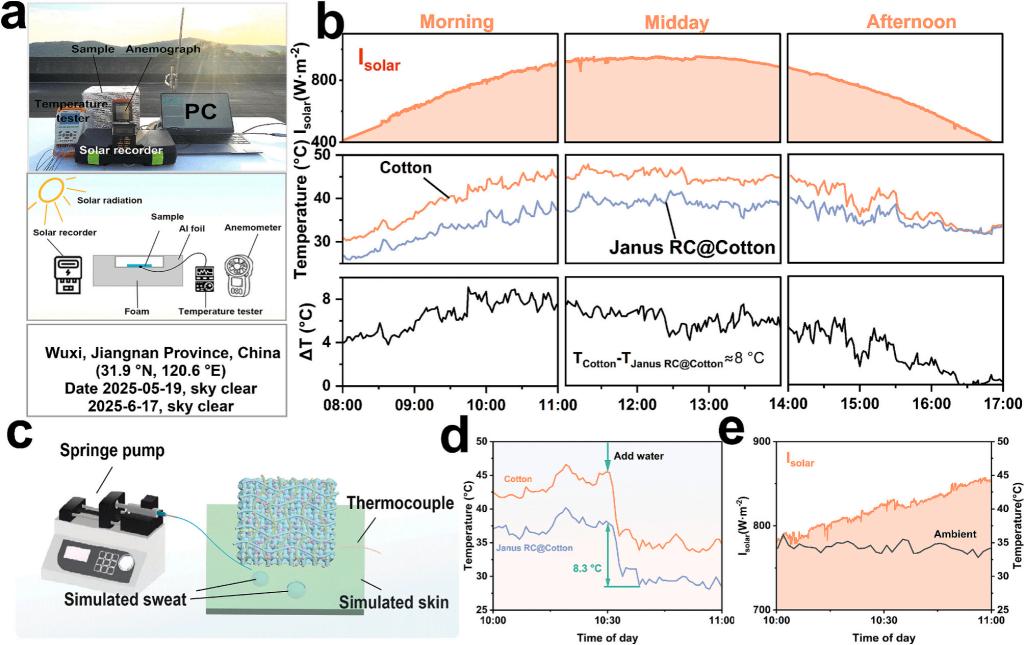 结果表明,在室内,潮湿状态下的Janus RC@Cotton比干燥状态温度下降了6.6 ℃。Janus RC@Cotton相比于未处理棉织物最大能实现9 ℃的降温。在室外,Janus RC@Cotton相比于未处理棉织物最大能实现8 ℃的降温。在皮肤出汗的条件下,Janus RC@Cotton可以实现优异的亚环境冷却(8.3 ℃)。Janus RC@Cotton具有优异的耐久性,在40次洗涤后仍然保持10 ℃左右的降温效果。同时,静电涂层网络赋予了织物高效的抗菌性能,对大肠杆菌和金黄色葡萄球菌的抗菌率达到99.9%。