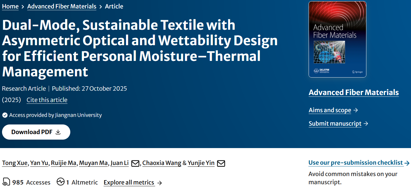 近日,成人网站智能纺织新材料研究室殷允杰教授在国际顶级期刊Advanced Fiber Materials上在线发表了题为“Dual-Mode, Sustainable Textile with Asymmetric Optical and Wettability Design for Efficient Personal Moisture-Thermal Management”的研究论文。该研究通过分层静电纺丝技术,制备了一种具有不对称光学性能、润湿性和孔径分布的双模式聚乳酸基个人热管理纺织品(DMTex),用于高效的个人湿热管理。独特的光学结构设计和功能颗粒的添加使DMTex具有优异的光学性能。三层结构设计赋予DMTex优异的单向导湿和防反渗性能。同时,DMTex还具有良好的耐磨性、生物相容性和可降解性。这种双模且可持续的DMTex在实现高效的个人湿-热舒适性方面展现出巨大潜力。成人网站-亚洲成人网-欧美成人网