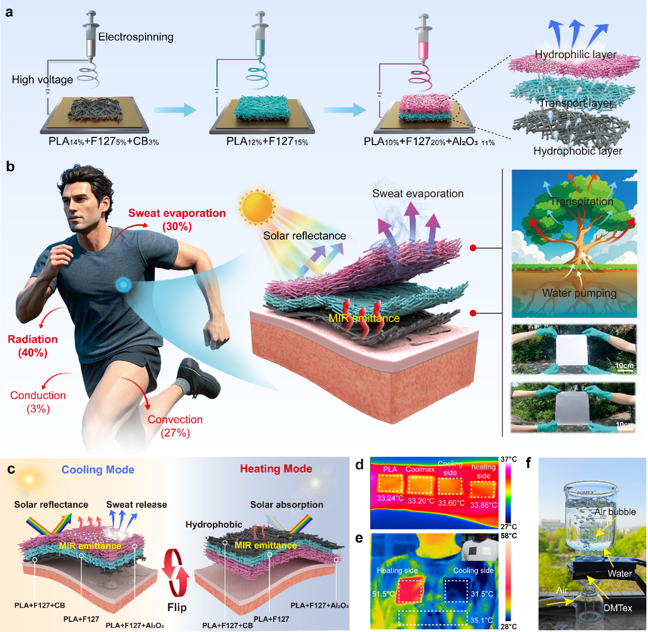 该研究通过分层静电纺丝技术(图1a),调控纺丝液浓度和组成,成功制备出三层结构的双模式湿热管理纺织品(DMTex)。其设计灵感源自植物蒸腾作用(图1b),通过构建“大孔-小孔”和“疏水-亲水”的渐变梯度,实现人体汗液高效传递。同时,依托两侧非对称光学特性,借助对太阳光的高效反射和吸收调节人体温度,可通过翻转在制冷与制热模式之间切换(图1c)。高温环境下,冷却侧朝外,不仅反射太阳光、发射人体红外辐射实现降温,又能及时排出汗液以提升热湿舒适;低温环境下,加热侧朝外,利用炭黑粒子捕获并转化太阳光为热量以温暖人体。实验者穿着缝合DMTex的棉衬衫在阳光下站立,红外热成像(图1e)直观验证了其实际穿戴场景中的控温效果。