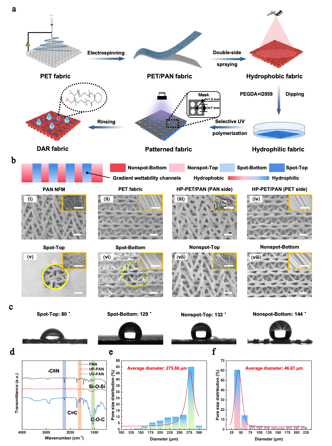 图2DAR织物的制备及其基本特性。a)DAR织物的制备示意图。b)DAR织物区域图及PAN NFM、PET和HP-PET/PAN织物的SEM图。比例尺:500 µm。插图是放大的扫描电镜图像。比例尺:50 µm。c)DAR织物不同区域WCA。d)PAN、HP-PAN和UV-PAN织物的FTIR曲线。e)PET基材和f)UV-PET/PAN织物的孔径分布。