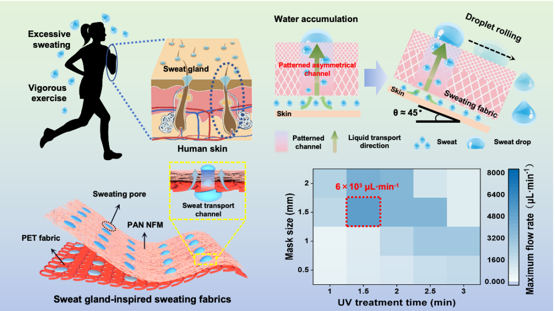 该研究受人体汗腺启发,成功开发出一种具有图案化不对称结构的“排汗织物”,使每个单独的汗液传输通道都具有物理和化学不对称性(孔径差异和局部渐变润湿性),使织物像皮肤一样通过“汗腺”通道将汗液反重力定向输送至织物外表面并聚集成汗滴,随人体摆动可轻松滑落(滚动角约45°)。该排汗织物的单向导水速率高达12.2 mL·cm-2·min-1,远超人体出汗速度,实现了可持续的汗液管理。为伤口护理,生物流体监测和微流体控制的先进纤维材料的开发提供了有效策略。论文第一作者为朱豆豆博士,成人网站