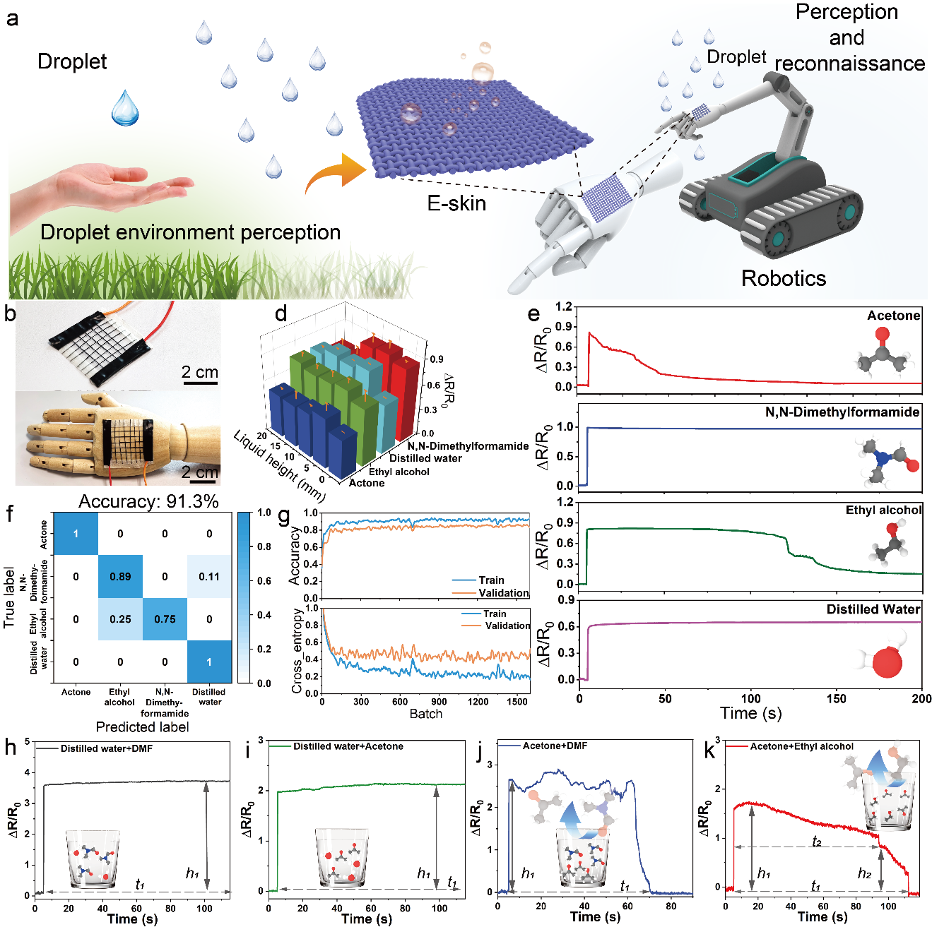 图6展示了压阻阵列在不同液体滴落/流动过程中的电阻变化特征,以及机器学习模型对液体类别的识别效果。在室温(20±3 °C)与40%±2%湿度条件下,系统可同时感知液体体积、运动状态等信息;分类模型识别准确率可达91.03%,并未出现明显过拟合,为构建面向智能制造的液体监测与预警电子纺织品提供了可行路径。