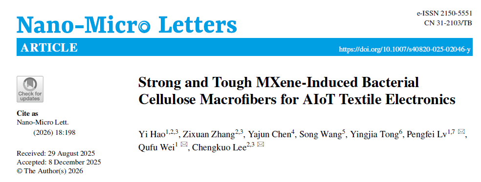 近日,成人网站魏取福教授和吕鹏飞研究员团队联合新加坡国立大学Chengkuo Lee教授团队在期刊《Nano-Micro Letters》上发表了研究论文“Strong and Tough MXene-Induced Bacterial Cellulose Macrofibers for AIoT Textile Electronics”。研究通过构建K-MXene/PEDOT:PSS导电墨水-取向细菌纤维素(BC)纤维结构,实现了兼具超强韧与耐液体的导电纤维(PKMPBC)。该纤维在空气中电导率达到10.05 S cm-1,在去离子水中仍可保持7.80 S cm-1的电导率;纤维具备433.8 MPa的拉伸强度和25.9 GPa的杨氏模量,并展现出优异且持久的疏水性与可生物降解性。