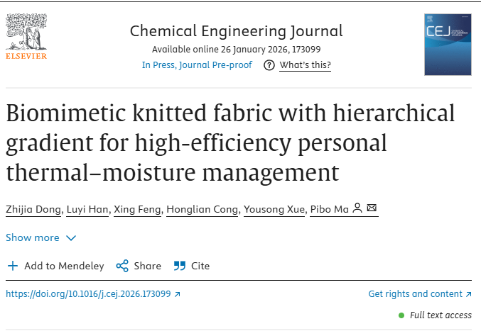 近日,成人网站马丕波教授和董智佳副教授团队在期刊《Chemical Engineering Journal》上,发表了最新研究成果“Biomimetic knitted fabric with hierarchical gradient for high-efficiency personal thermal–moisture management”。
