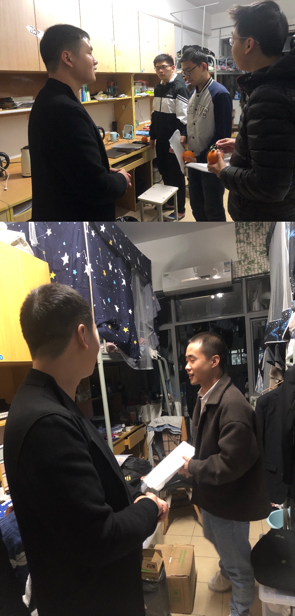 “最近复习进度和情绪怎么样?天冷了,注意保暖,别感冒…”近日,本着不打扰考生复习考试,“学生在哪就去哪”的原则,纺织学院党委副书记陈艳君,毕业班辅导员吴丹来到学生宿舍等地慰问考研学生,送上学院精心准备的笔袋和橙子