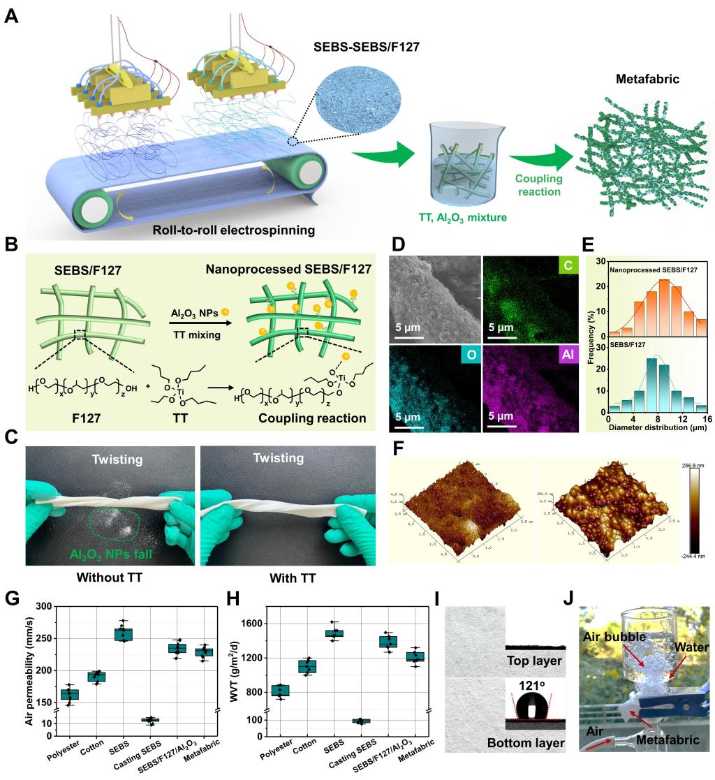 作者采用大规模静电纺丝和偶联辅助浸涂技术构建了分层结构超织物。具体来说,该超织物由疏水性的Styrene-ethylene-butylene-styrene(SEBS)非织造布内层与亲水性的SEBS/PPO-PEO-PPO (F127)/Al2O3复合材料外层组成,将Janus润湿性和蒸发散热集成到被动辐射冷却系统中。我们通过将F127与高折射率(n≈1.8)的Al2O3光散射体集成,合理调节并增强了超织物的太阳反射率至≈92%,大气窗口热发射率达到≈97%。