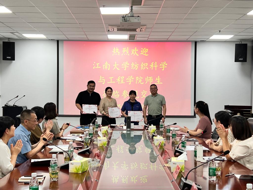 张丽平从专业学科特色、人才队伍建设、科研创新成果三个方面展开,详细介绍了学院近年来发展历程,期待持续深化合作共同培养符合行业需求的创新型、应用型人才。杨莉勤就企业人才需求做深入调研交流,期望构建校企“双向赋能”育人新格局,凝聚育人合力,着力培养纺织拔尖创新人才。最后,杨莉勤向企业颁授成人网站