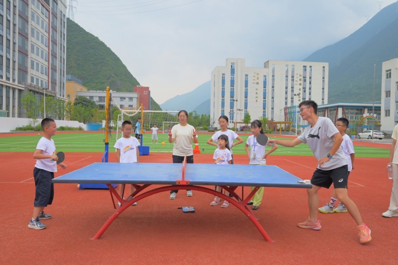 日常开展课程教学之外,支教团还在周末精心策划了趣味运动会,孩子们踊跃报名,运动场成为团队协作与欢乐的海洋。“两人三足”从磕绊到默契,“旋风跑”在旋转尖叫中冲刺,乒乓球桌上紧张对决,室内一分钟跳绳“唰唰”声整齐划一。到了颁奖时刻,“运动小达人”们高举奖状,在阳光下定格成这个夏天最珍贵、最温暖的画面。这场跃动的课堂不仅让山区的童年听见了欢呼声和掌声的回响,更让孩子们成长的足迹带上了团结、坚韧与自信的鲜明底色。