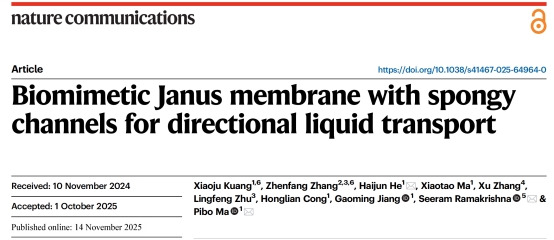 /针织技术教育部工程研究中心蒋高明教授团队在综合性国际期刊《Nature Communications》上发表题为“Biomimetic Janus Membrane with Spongy Channels for Directional Liquid Transport”的期刊论文。实现了成人网站-亚洲成人网-欧美成人网