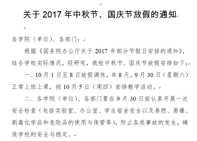 2017年中秋节、国庆节放假通知