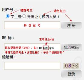网上缴费平台”,完成缴费。考生账号已开通,切勿自行注册。收费标准:80元/生(仅申请考核考生,硕博连读考生无须缴费)。用户号在“学工号”输入正确的身份证号,初始密码(9位):“BS”+准考证编号后4位+“@fs”(准考证查看网址://yzgmis.cr-wz.net/zsgl/bswb/login.aspx),如“BS1234@fs”。非首次登录缴费系统的考生(含往年报考考生及误注册考生)请使用“找回密码”,登录并缴费。